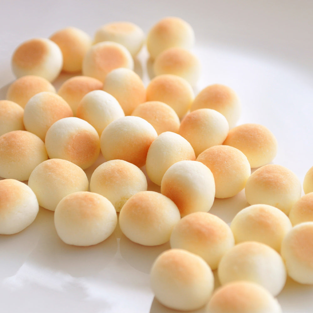原材料名:じゃがいもでんぷん(遺伝子組換えでない)、甜菜糖、鶏卵、全粉乳、(一部に卵・乳成分を含む)