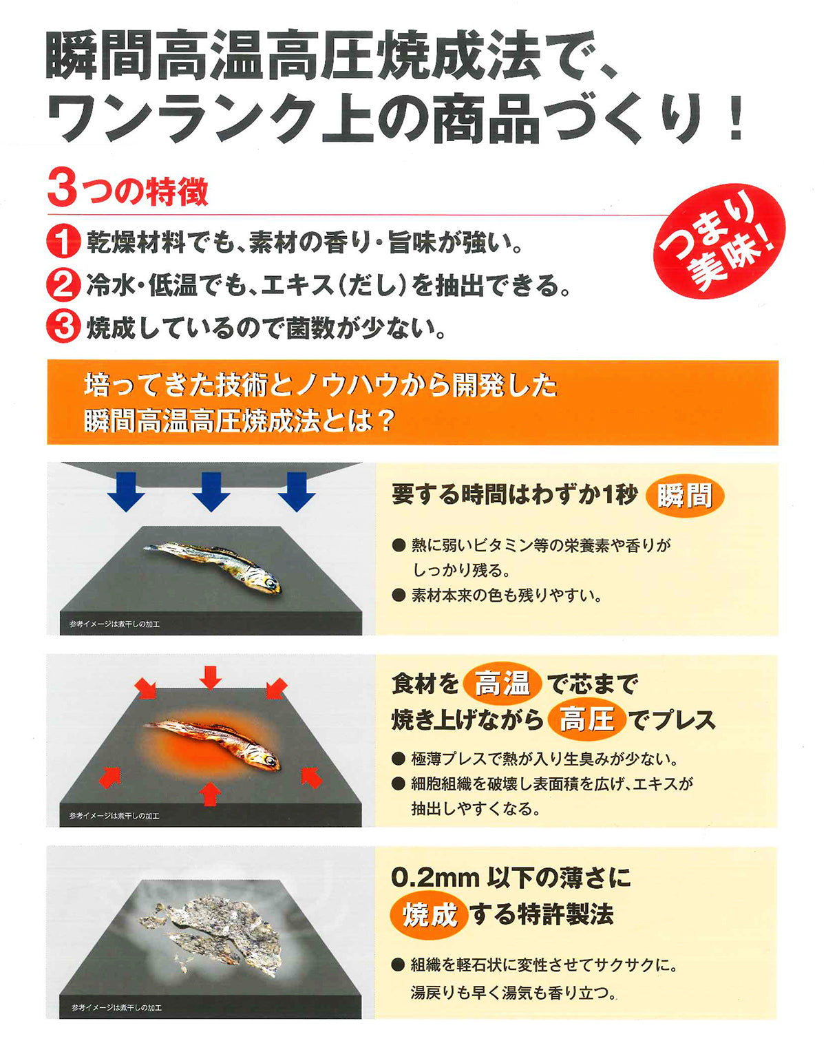 瞬間的に200℃以上の熱で一瞬で芯まで均一に焼成することで組織が壊れ、およそ60トンの圧もかけて加工することで、素材の持つ「うま味」や「香り」をギュッと凝縮。さらに栄養素も逃がしません。