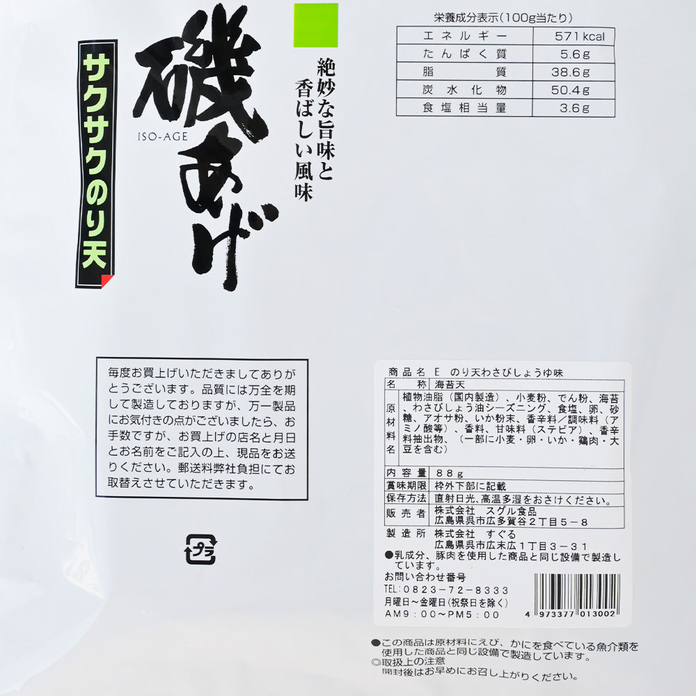 原材料:植物油脂(国内製造)、小麦粉、でん粉、海苔、わさびしょう油シーズニング、食塩、卵、砂糖、アオサ粉、いか粉末、香辛料/調味料(アミノ酸等)、香料、甘未料(ステビア)、香辛料抽出物、(一部に小麦・卵・いか・鶏肉・大豆を含む)