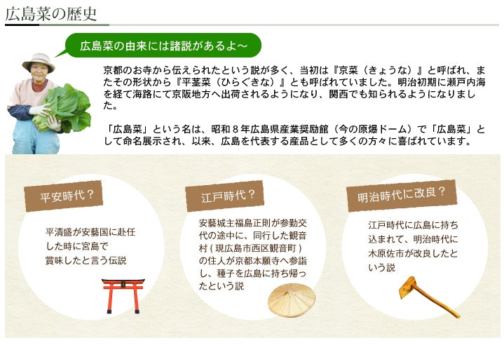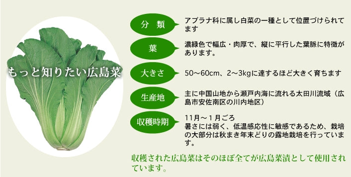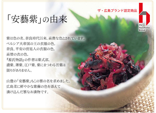 原材料:【安藝紫(あきむらさき)】広島菜、しそ、ごま、漬け原材料(しょうゆ(小麦を含む)、アミノ酸液、たん白加水分解物、こんぶエキス)/調味料(アミノ酸等)、酸味料、香料、着色料(赤106)【倭(やまと)】広島菜、きゅうり、しそ、ごま、漬け原材料(しょうゆ(小麦を含む)、糖類(果糖ぶどう糖液糖、砂糖)、発酵調味料、食塩)/調味料(アミノ酸等)、酸味料、香料