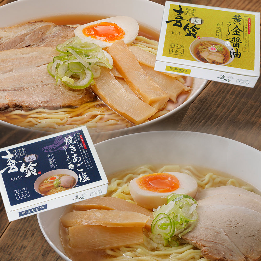 喜多方ラーメン 専門店「喜鈴」黄金醬油&焼きあご塩ラーメン 各4食 合わせて8食セット 長崎産飛魚 北海道産昆布使用 福島 人気麺 ご当地ラーメン 送料無料
