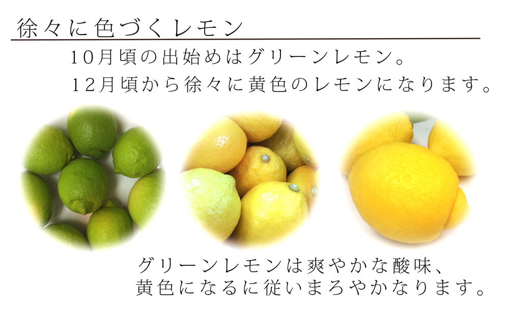 レモンは、10月から12月までは、グリーンレモン それ以降は、通常の黄色レモンです。