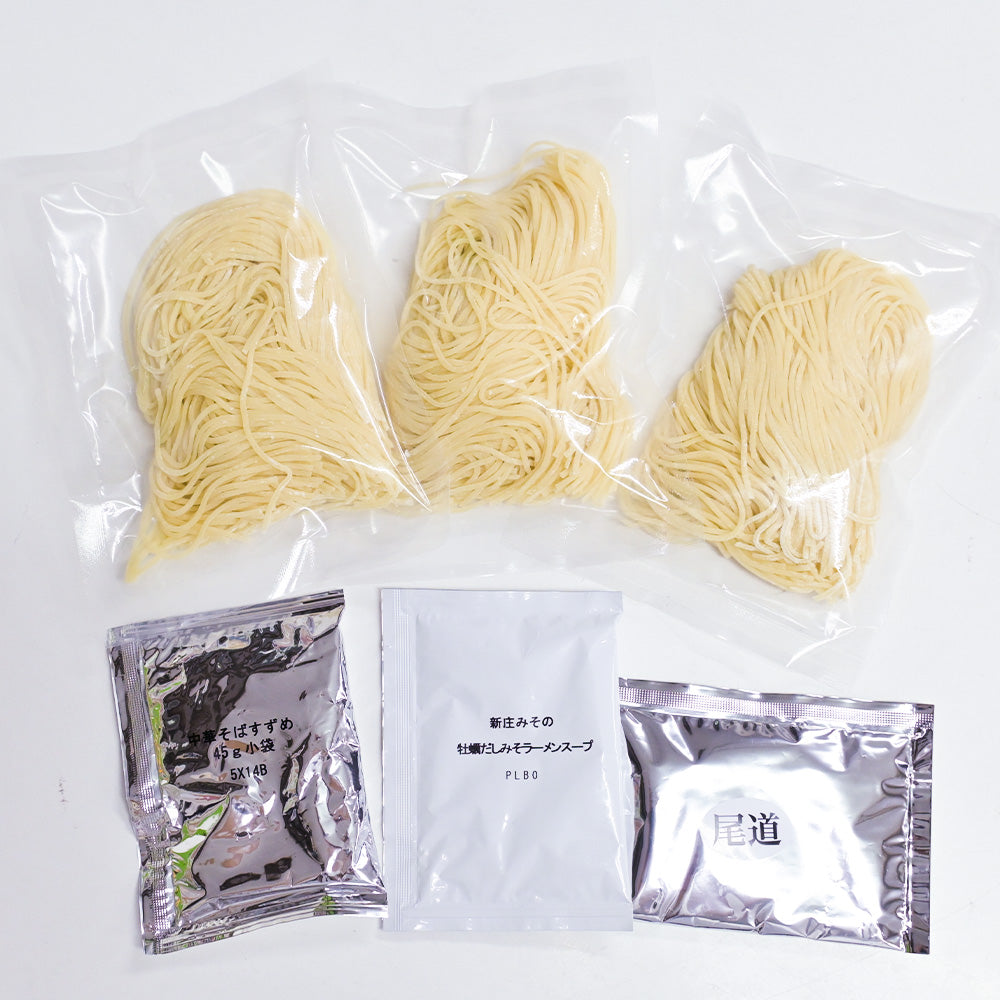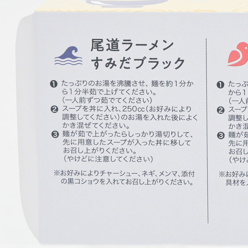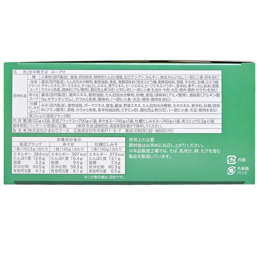 内容量(1箱あたり):麺100g×3袋、尾道ブラックスープ50g×1袋、 寿々女スープ45g×1袋、 牡蠣だしみそスープ40g×1袋、黒コショウ0.3g×1袋