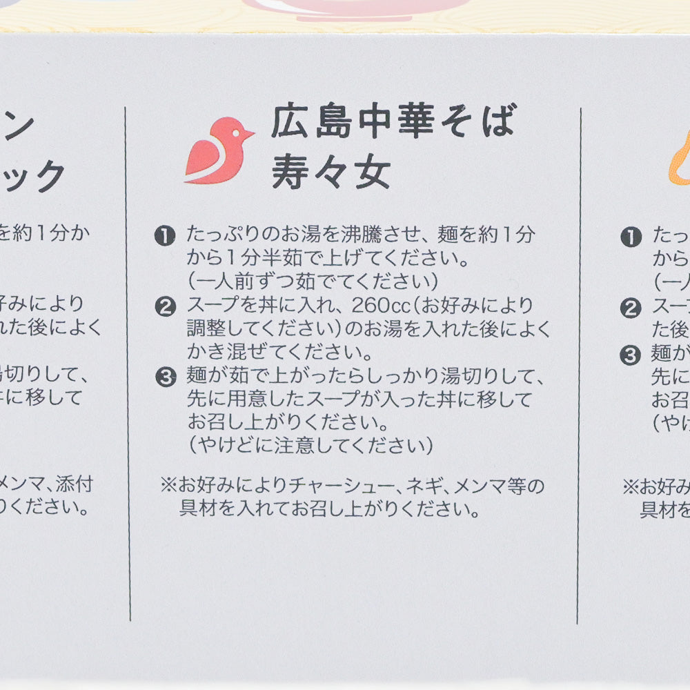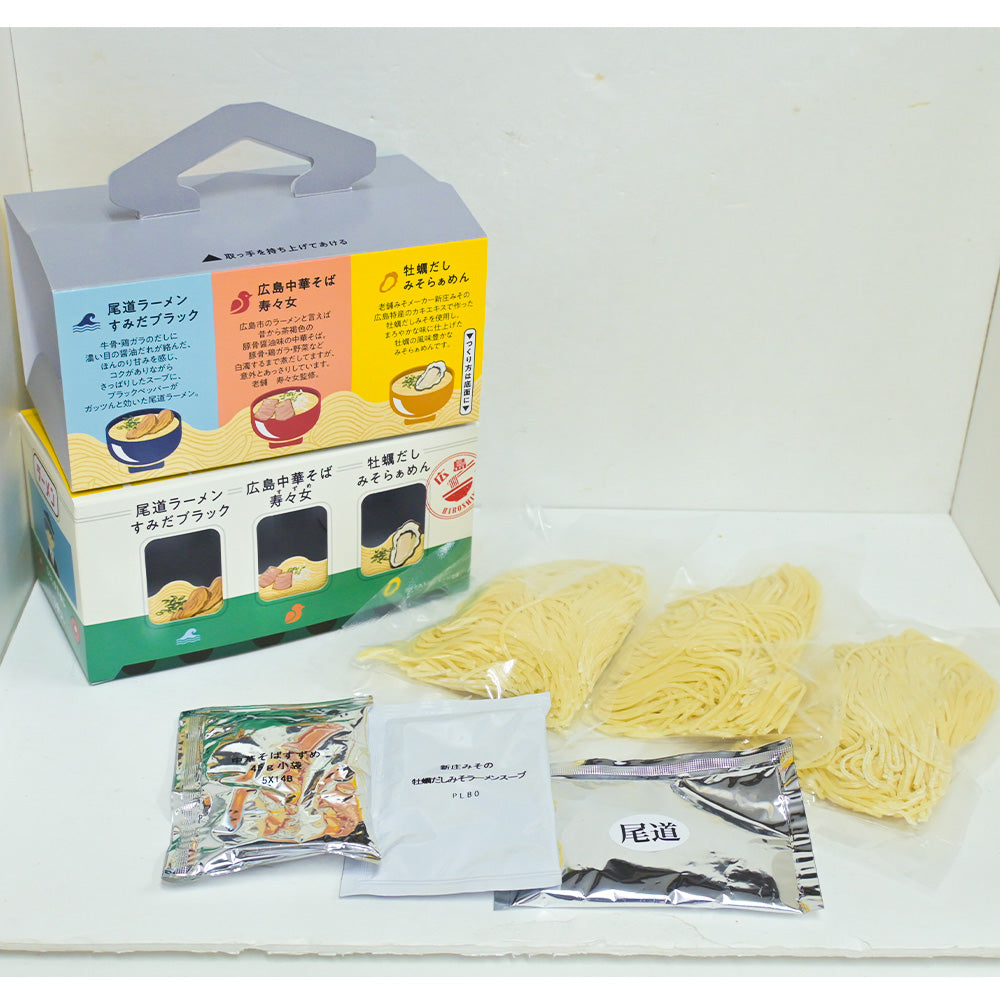 3種の醤油スープでコクのある味わいの「尾道ラーメン すみだブラック」、醤油豚骨ラーメンのあっさり系、老舗の「広島中華そば 寿々女」、広島老舗味噌メーカー 新庄味噌のかきだしみそを使用した「牡蠣だしみそらーめん」の3種セットです。