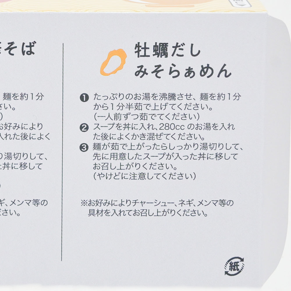 原材料名:【麺】小麦粉(国内製造)、食塩、卵白粉末、植物性たん白/酒精、加工デンプン、かんすい、 焼成カルシウム、(一部に小麦・卵を含む) 【尾道ブラックスープ】醤油(国内製造)、たん白加水分解物、動物油脂、食塩、発酵調味料 (液状ぶどう糖、発酵調味料、酒精、その他)、砂糖、ぶどう糖、チキンエキス、ポークエキス、かつおぶしエキス、煮干エキス、ビーフエキス、ビーフエキスパウダー、香辛料、煮干いわし粉末/酒精、カラメル色素、調味料(アミノ酸等)、酸化防止剤(VE)、ビタミンB1、(一部に小麦・乳成分・牛肉・大豆・豚肉・鶏肉・ゼラチンを含む)【寿々女スープ】醤油 (国内製造)、 畜肉エキス、 動物油脂、たん白加水分解物、砂糖、食塩/調味料(アミノ酸等)、増粘剤(アルギン酸Na、キサンタンガム)、カラメル色素、酸味料、(一部に小麦・大豆・鶏肉・豚肉を含む)【牡蠣だしみそスープ】みそ (国内製造)、 動物油脂、ポークエキス、食塩、醤油、野菜エキス、たん白加水分解物、カキエキス、香辛料、砂糖/調味料(アミノ酸等)、酒精、カラメル色素、香辛料抽出物、ビタミンB1、酸化防止剤(VE)、(一部に小麦・大豆・豚肉を含む) 黒コショウ(尾道ブラック用)