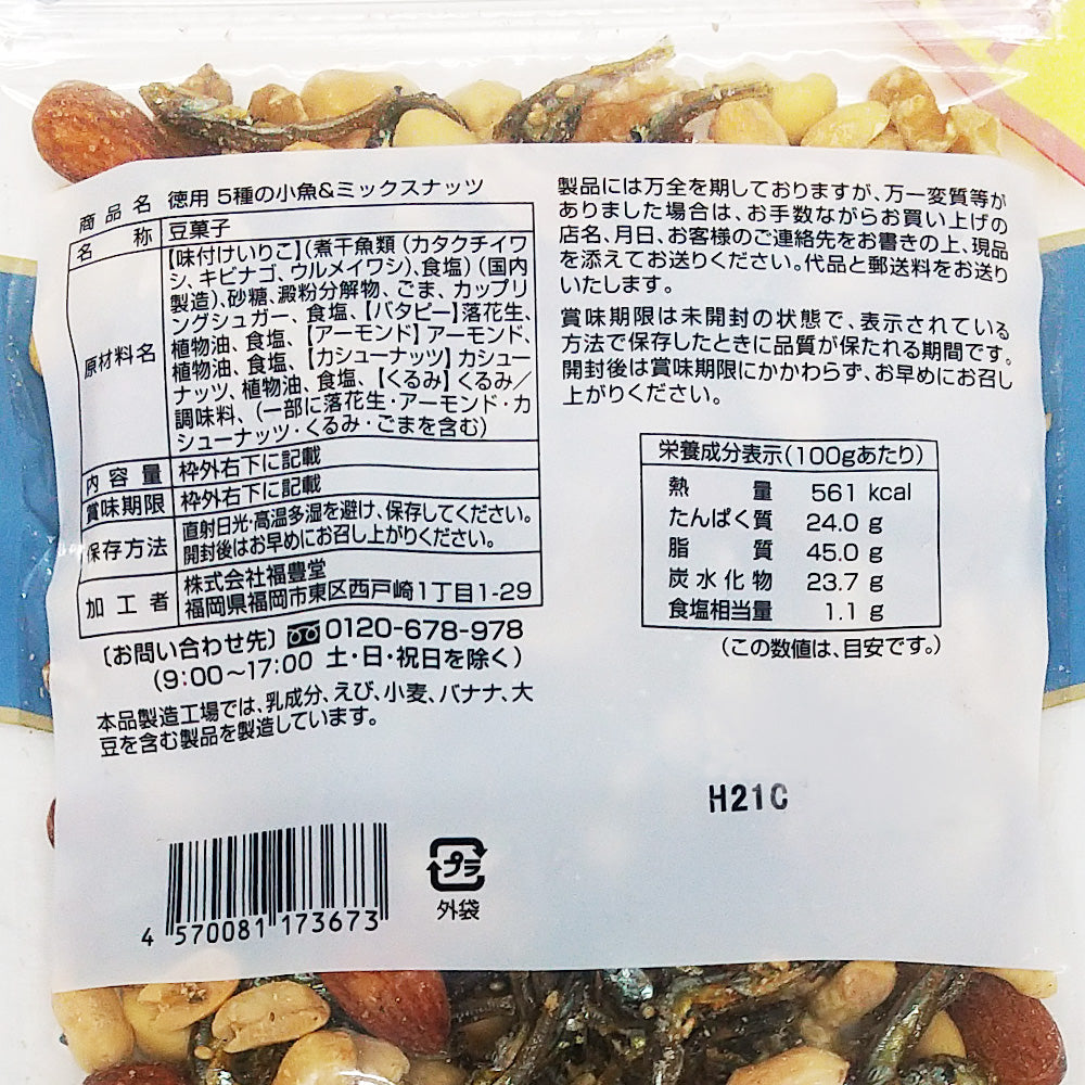 バラエティ豊かな5種類の小魚&ミックスナッツです。