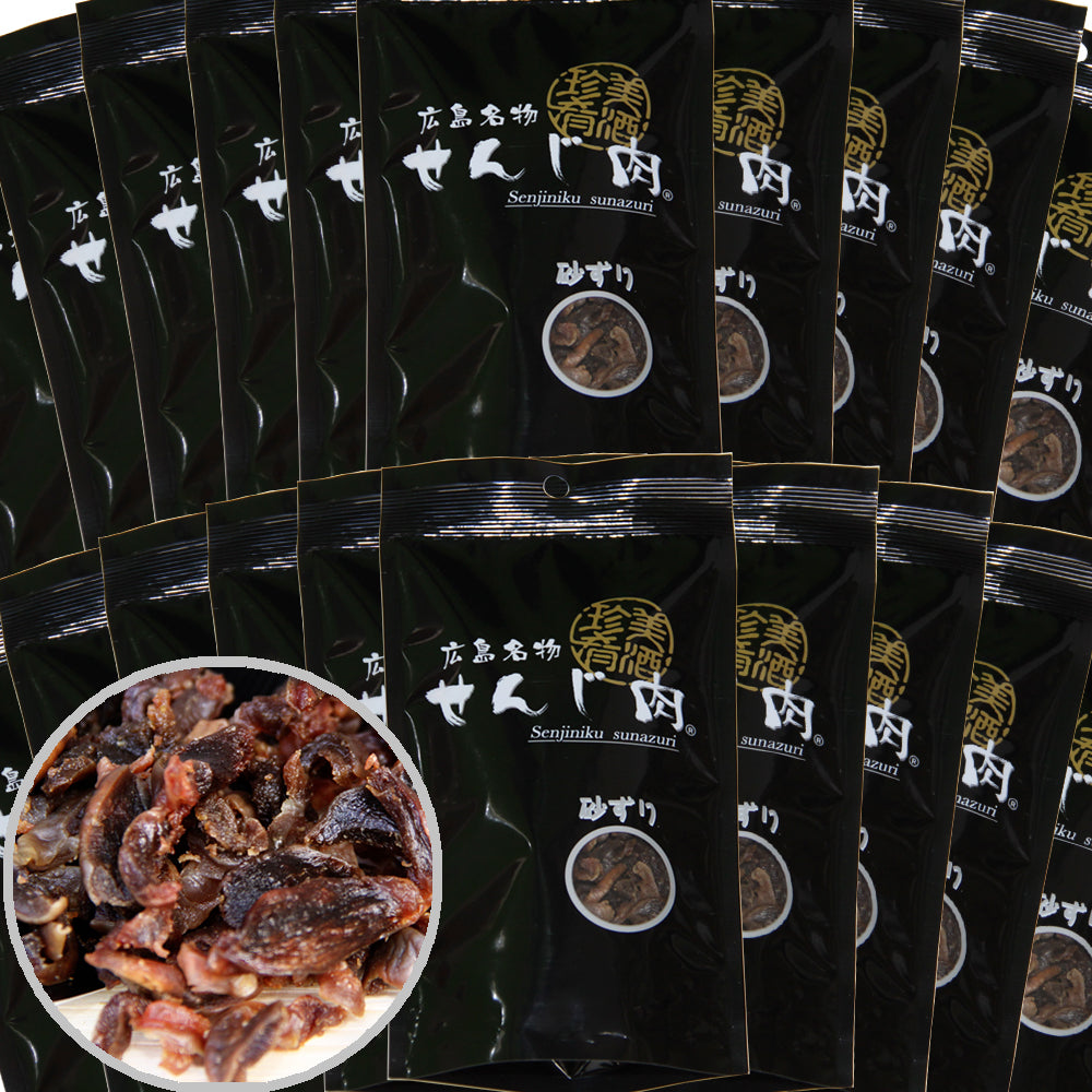 TVで話題の激ウマ広島B級グルメ! 「せんじ肉」とは豚のホルモンを揚げて干したものに塩で味付けした、広島の名物珍味です。 せんじ肉の名前は豚ホルモンを「煎じる」という調理行程が由来とされており、地元では「せんじがら」という名称でも親しまれています。 コリッとした硬さが特徴で、噛めば噛むほどじわりと肉のうまみが溢れ出す、ビールなどのお酒のおつまみに最適な一品です。 せんじ肉の主なフレーバー せんじ肉 せんじ肉といえばコレ!豚ホルモンを揚げて干した定番のホルモンおつまみです。新鮮な豚の胃を食べやすく一口サイズにカットしました。味付けはシンプルですが、ホルモンのうまみがしっかり凝縮されており、スルメのように長く噛めば噛むほどじわぁーっとうまみが広がります。 スパイシーせんじ肉 黒胡椒とみそをベースに味付けをしたスパイシーなフレーバーです。ホルモン特有の臭みが気になる方や、スパイシーな味が好きな方におススメ!溢れ出るホルモンのうまみとコショウの組み合わせはやみつき間違いなしです! せんじ肉砂ずり こちらは豚ホルモンではなく、鶏の「砂肝」を煎じて揚げたおつまみです。焼き鳥でもおなじみの「砂肝」は鶏の砂嚢とよばれる部位で、食べたものをすりつぶすための器官です。脂肪が少なくコリコリと弾力があります。また、「砂ずり」とは九州や関西などの西日本で定着している砂肝の呼び方です。砂ですりつぶすという事が由来と言われています。豚ホルモン以上にコリコリとした歯ごたえとタンパクな味わいが病みつきです! せんじ肉豚ハラミ...