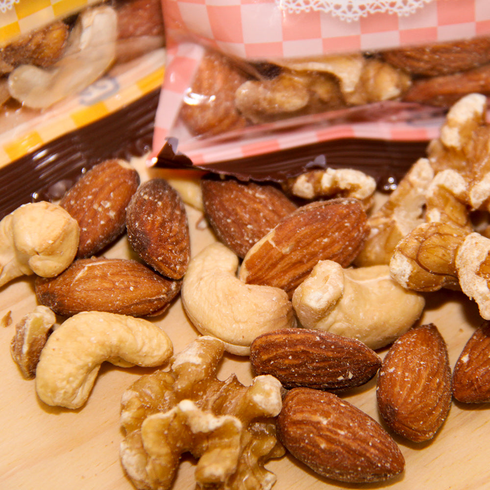 原材料名:アーモンド(米国)、カシューナッツ、クルミ(米国)、(一部にカシューナッツ・くるみを含む)